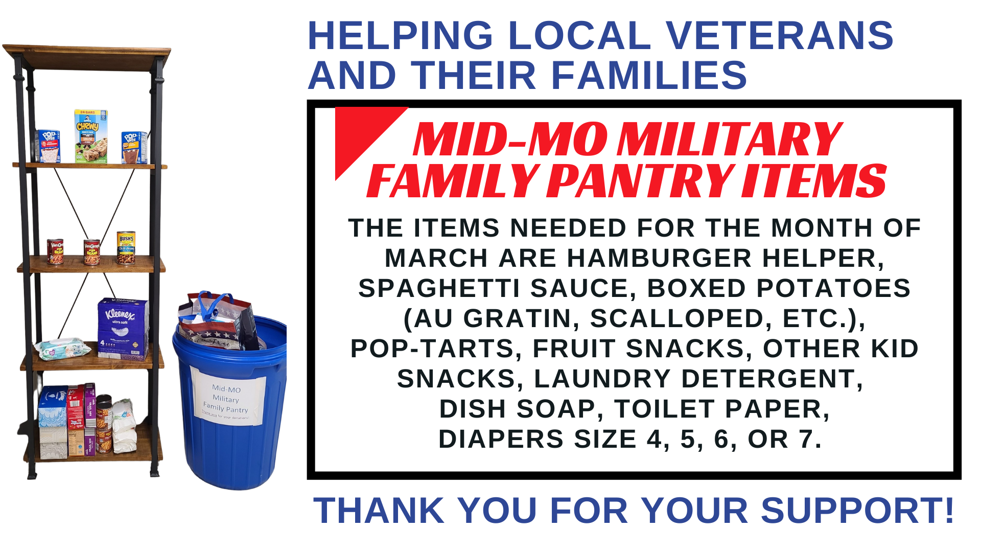 Donations of these items will be used to help local veterans and their families. Your donated items can be placed in the Mission Cafe area at Wesley UMC. Thank you for your continued support. The Mid-Mo Military Family Pantry helps central Missouri military families and veterans.