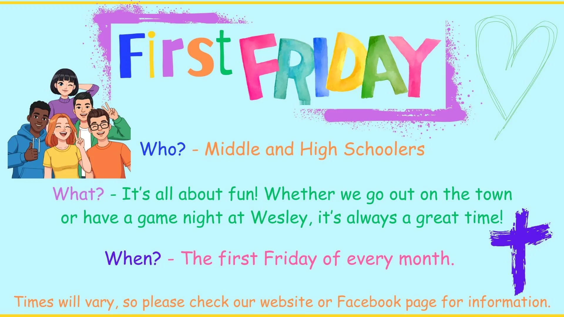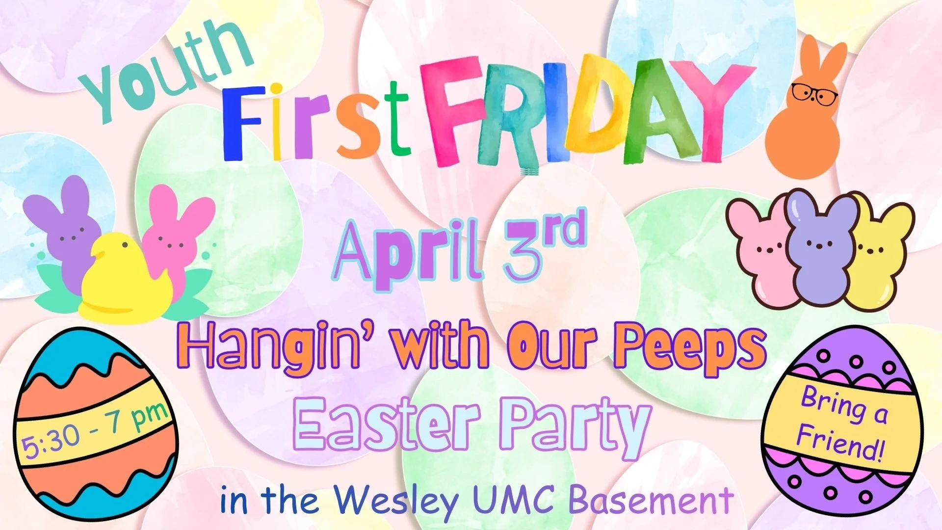 The next First Friday will take place on April 3, at 5:30 pm at Wesley UMC, where the youth will help with the Easter Egg Hunt preparation that will take place on Saturday, April 4, at 9:00 am on the Wesley UMC campus for children ages 2 and older.